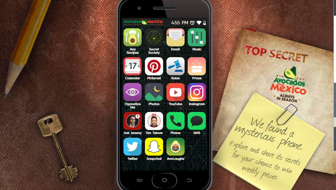 Avocados from Mexico is the brand that assumed the creation of a immaginary secret world, ruled by dark secrets. Since 2016, the brand combined multiple elements to have a generous popularization coverage. How they did it? Through a series of apps that recreated a secret society. The mock up cellphone offers the whole range of very well-knows apps, but each is adapted to the experience of entering a secret society.