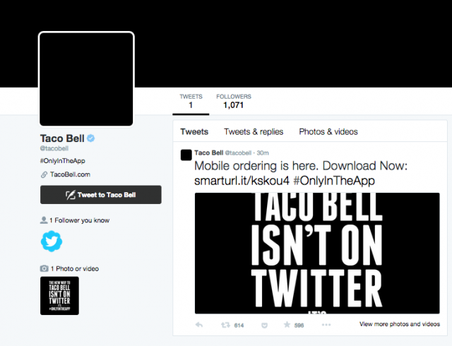 Another smart move on Twitter too. They created another Twitter account called @totallynothere that kept the original Taco’s account 1.4 million followers and reseted the @tacobell account to zero followers.